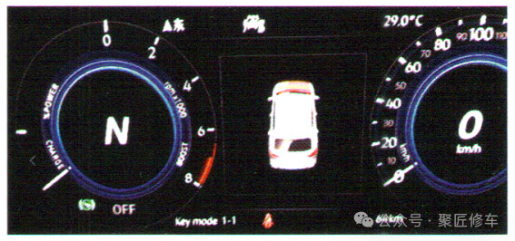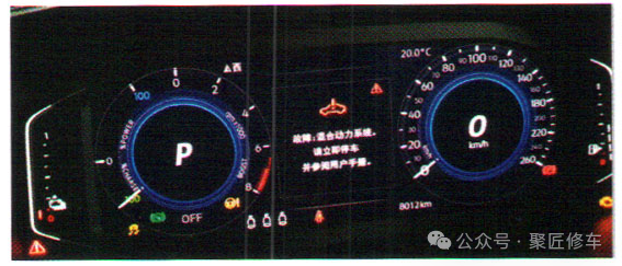 • 组合仪表显示混合动力系统故障,仪表板中央红色高压系统故障指示灯点亮。