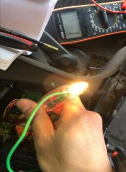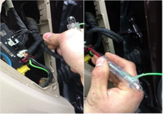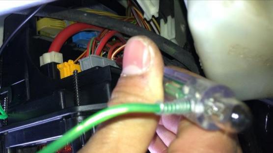使用试灯,试灯夹子夹负极,对图中的插头测量(见上图)。