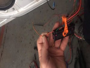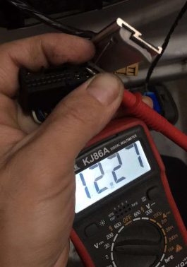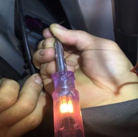 根据电路图得知驾驶员车门限位器处28针脚插头的1号针脚是12号10A保险供电,这个地方万用表有点不好测,用功率试灯测,功率试灯点亮(如下图):