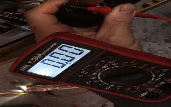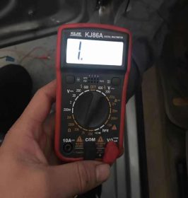 问题就出现在驾驶员侧车门控制单元20针脚插头12号脚到驾驶员车门限位器处28针脚插头的1号针脚线路断路或虚接。断开电源使用万用表二极管档测这根线的通断,蜂鸣器没有响,为了确定故障再使用万用表Ω档2K档位测线阻,显示为无穷大1(解释:测量线阻的时候一定要从大的档位开始测,因为小的档位测电阻过大也会显示为1)(如上图)。